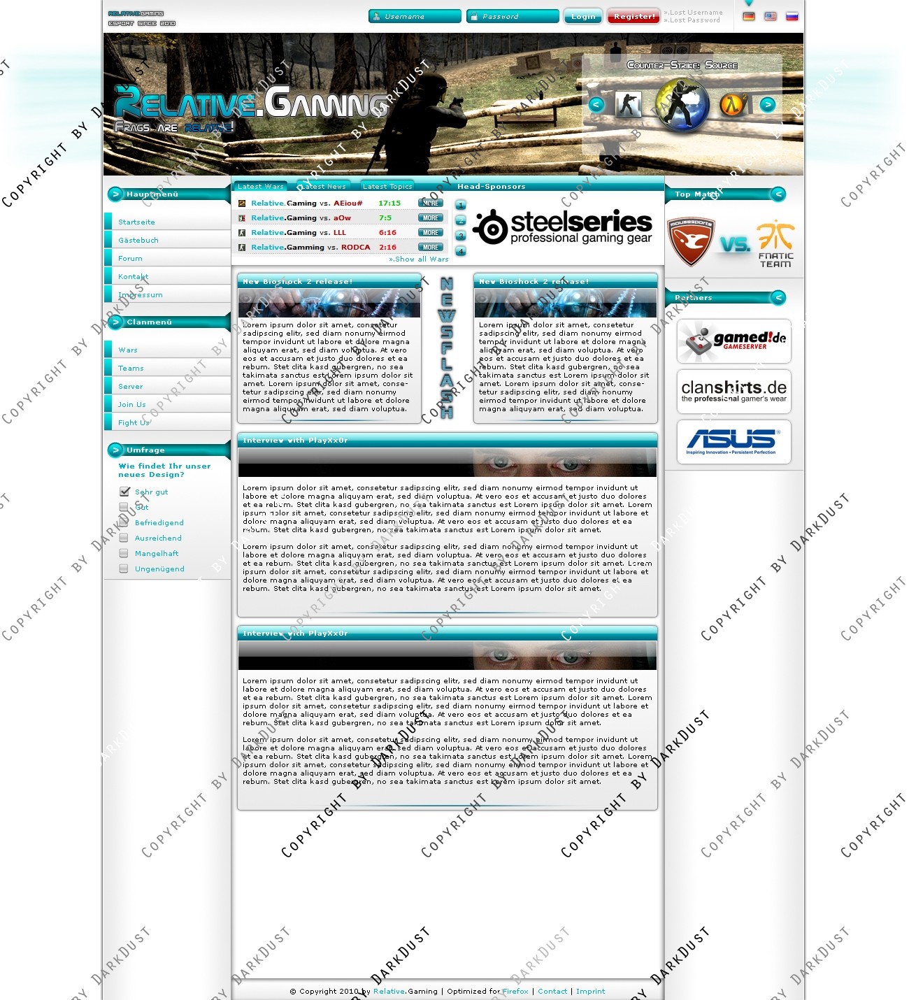 Hier verkaufe ich ein Clan-Design, welches ich in 10,2 Stunden Arbeit erstellt habe. Ich habe ein komplettes Konzept für dieses Design entworfen. Insgesamt soll die Seite sehr schlicht wirken, aber mit dem vielen Blau auch einen Hauch von Frische bekommen. Im Header befindet sich ein Game-Switcher, der auch mit einem Team-, oder Player-Switcher ersetzt werden kann. Alle Boxen im Layout sind natürlich auch in einer anderen Weise einsetzbar, als ich sie dargestellt habe. Insbesondere die Box im oberen Teil des Contents. Ich gebe ausdrücklich jedem Käufer die Möglichkeit, das Design auf eigene Wünsche weiter anzupassen! Für weitere Fragen stehe ich gerne zur Verfügung.