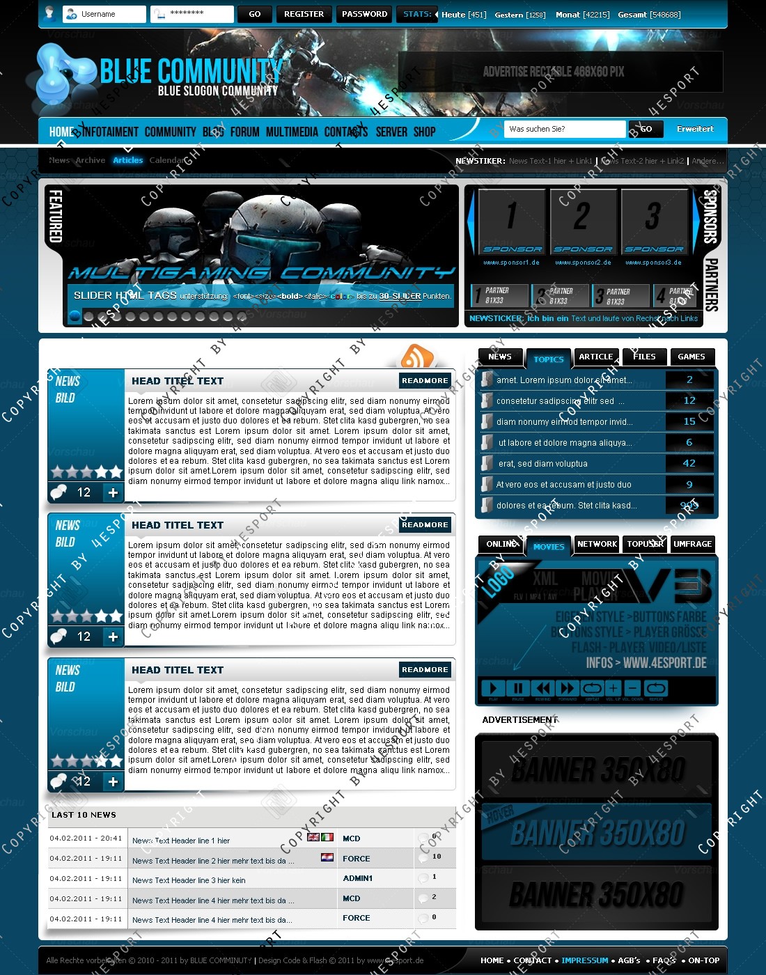 Blue Community Templates Premium edition mit Flash Player 1 V3 Custom Edition und Featured System, CMS Erweiterung Webspell 4.2.2a, wird auf wunsch auf ClanWORLD v1.1 auch gecodet.